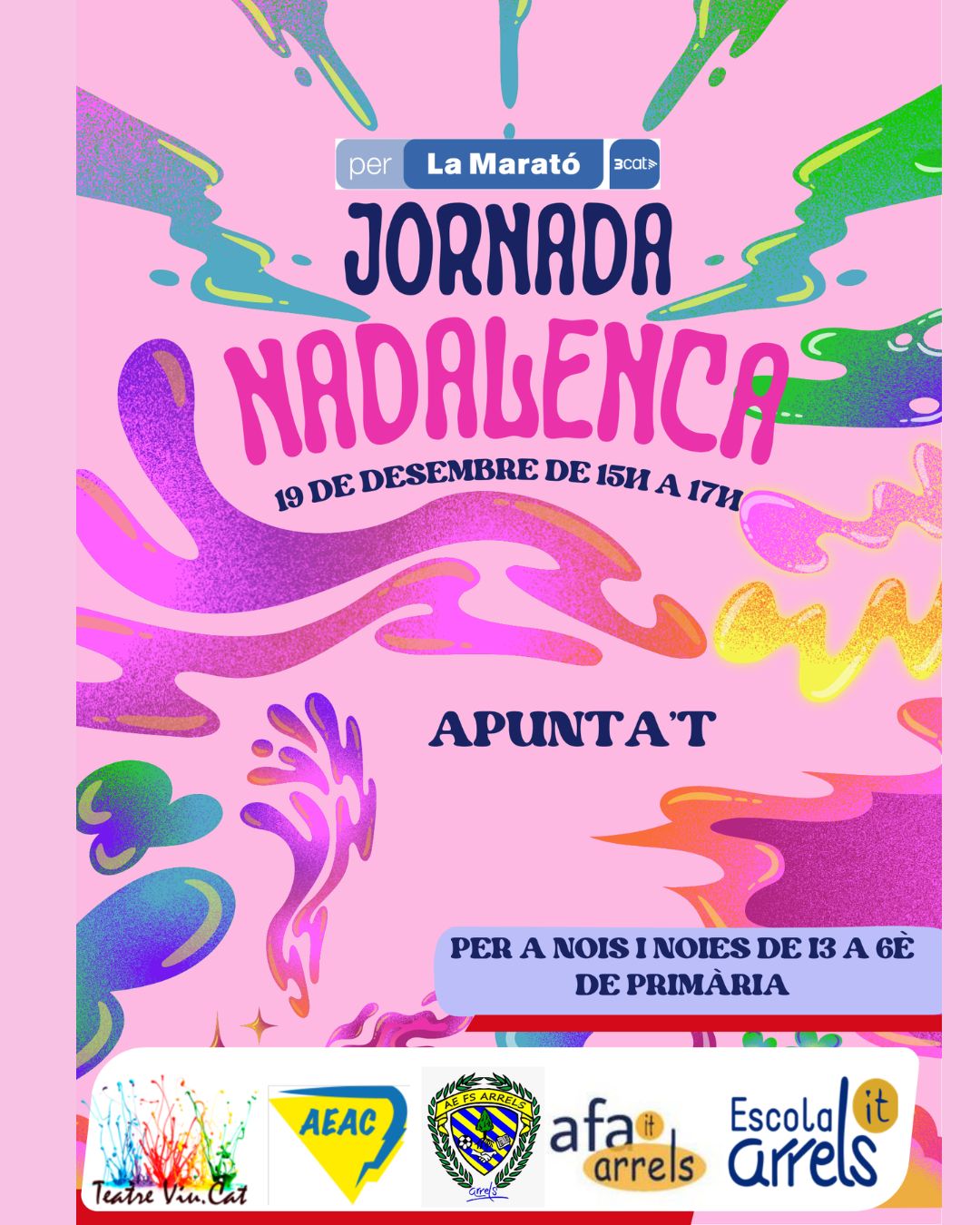 L’AE FS Arrels, Teatre Viu i l’AE Arrels Congrés, amb la col·laboració de l’Escola Arrels i l’AFA Arrels Congrés, organitzem aquest divendres 19 de desembre de 15 a 17h una nova edició de la Jornada Nadalenca, una tradició que any rere any ens reuneix en un esperit lúdic i solidari.